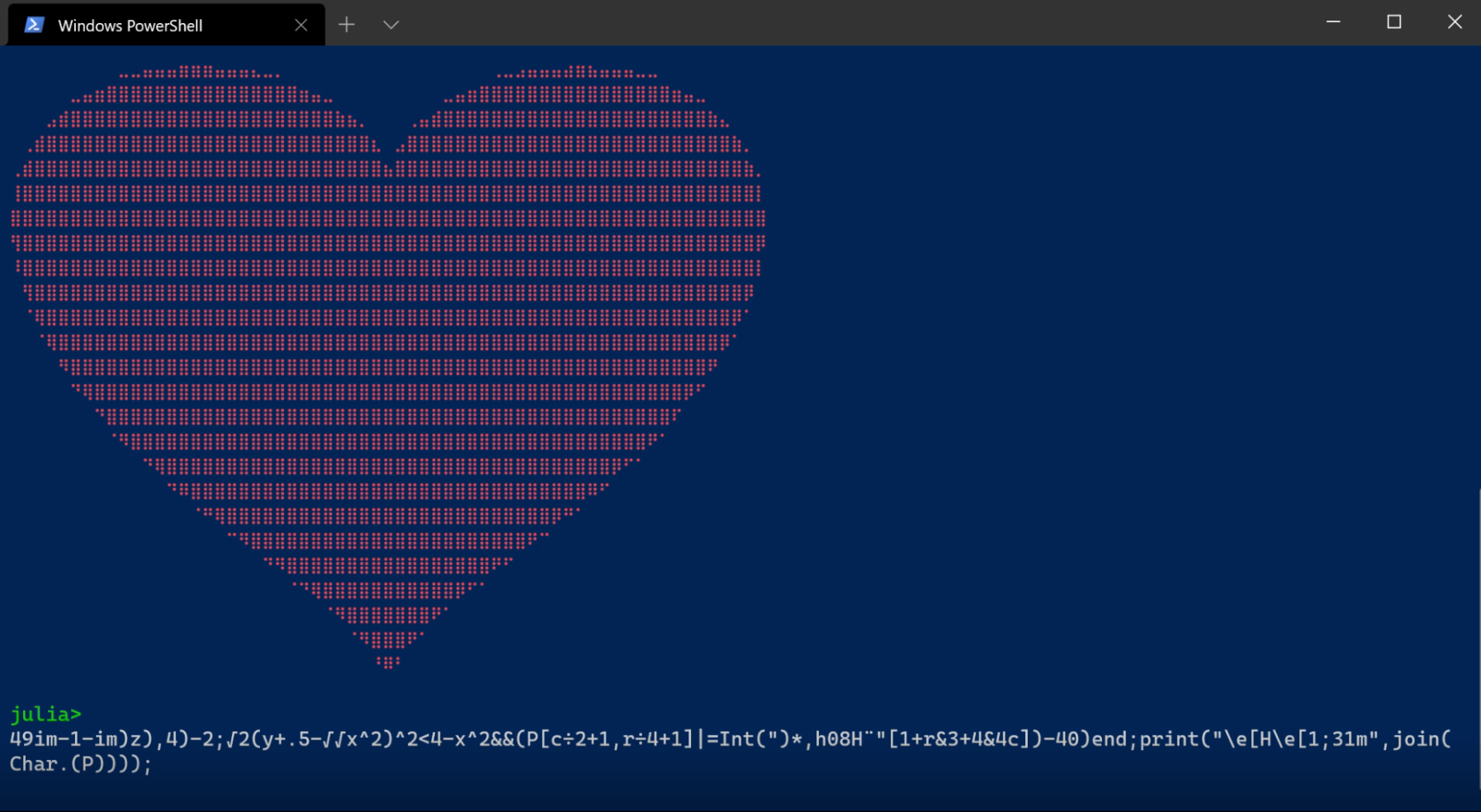 See this video of a small ASCII-art code golf written in Julia and executed in a Windows Terminal PowerShell:The really curious may try running the code in the standard CMD-Terminal or the built-in PowerShell-Terminal…