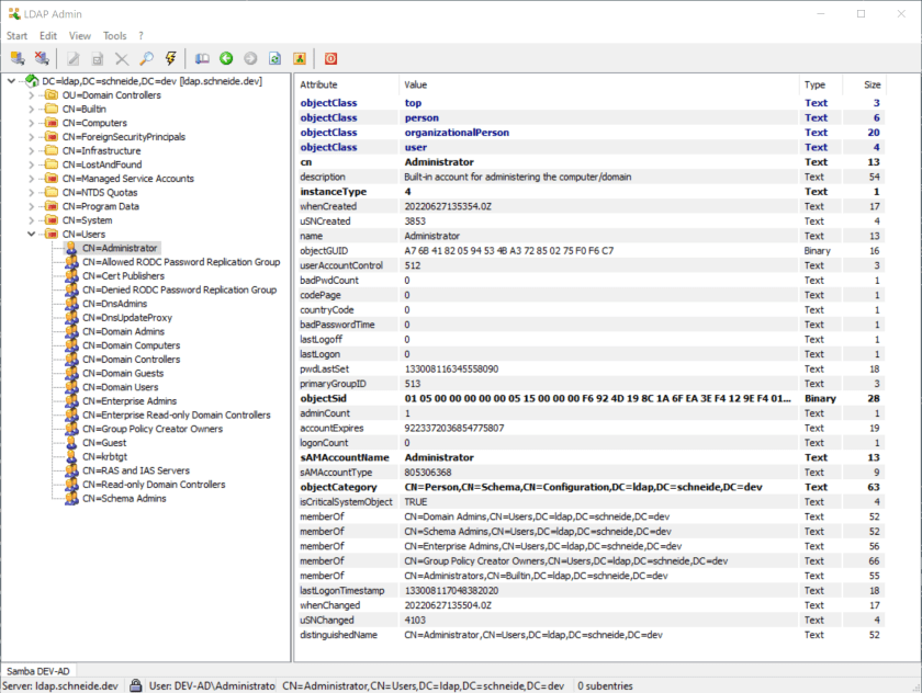 In the Username field I have: CN=Administrator,DC=ldap,DC=schneide,DC=dev