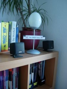 After we read about the lava lamps, we wanted to own them, too. But only after inspiration from the animated gif, we were sure about our specific realisation. We merged the two states into one lamp (on/off instead of green/red) and did without the lava. A normal desk light would do the job now.