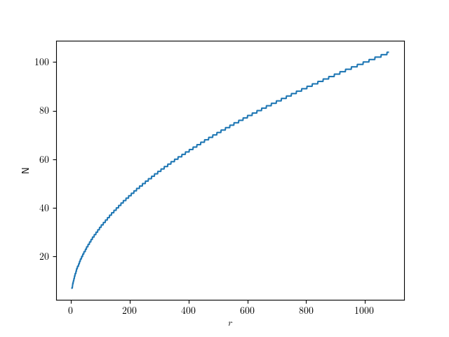 As you can see, this looks hyperbolic and the error falls off rather fast with an increasing number of subdivisions. This function lets use figure out the error for a given number of subdivisions, but what we really want is he inverse of that: Which number of subdivisions do we need for the error to be less than a given value. For example, assuming a 1080p screen, and a half-pixel error on a full-size () circle, that means we should aim for a relative error of . So we can solve the error equation above for N. Since the number of subdivisions should be an integer, we round it up: