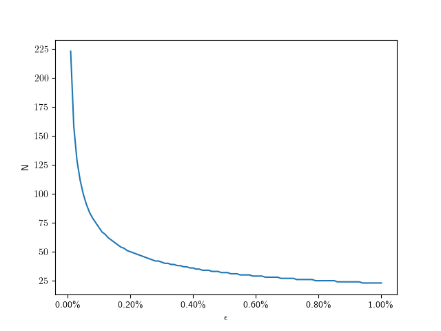 So for we need only 71 divisions. The following plot shows the number of subdivisions for error values from to :