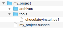 We need to create two files: one which specifies our package (my_project.nuspec) and one script which holds the deployment steps (chocolateyinstall.ps1). The specification file holds things like the package name, the package version (which can be overwritten when building the package), some pointers to project, source and license URLs. We can configure files and directories which will be copied to the package: in our example we use a directory containing our archives (aptly named archives) and a directory containing the installation steps (named tools). Here is a simple example: