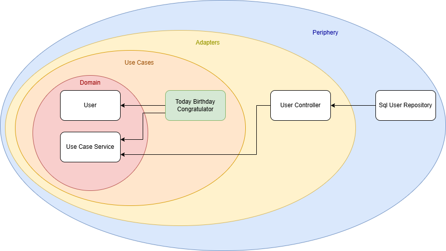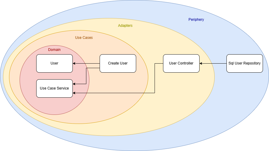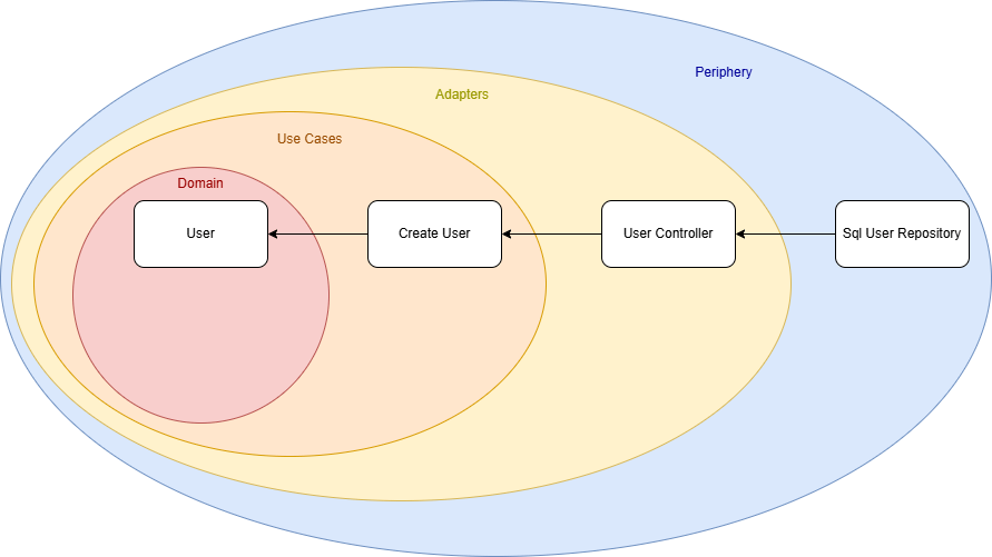 Our initial use case is a service that creates a user. The use case defines an interface that the user controller implements, meaning the dependency flows from the outer layer (the controller) toward the core. So far, so good.