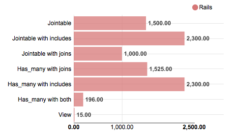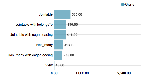Disclaimer: the absolute benchmark numbers are for illustration purposes, the relationship and the speedup between the different approaches are important (just for the curious: I measured 500 entries per table in a PostgreSQL database with both Rails 4.1.0 and Grails 2.3.8 running on Java 7 on a recent MBP running OSX 10.8)
